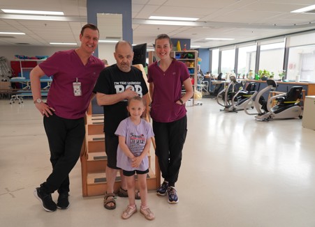 Rob Weir (middle) is on the road to recovery after his stroke back in January. With the help of his care team, including Joe Foris, Physiotherapist (left), Ally Brown, Occupational Therapist (right) and family (including his granddaughter Lilly), he's on the path to success.