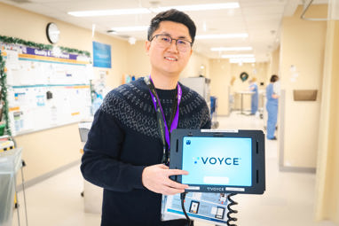Photo: Alden Leung, BCHS Quality and Risk consultant, stands with a Voyce device at Brantford General Hospital.